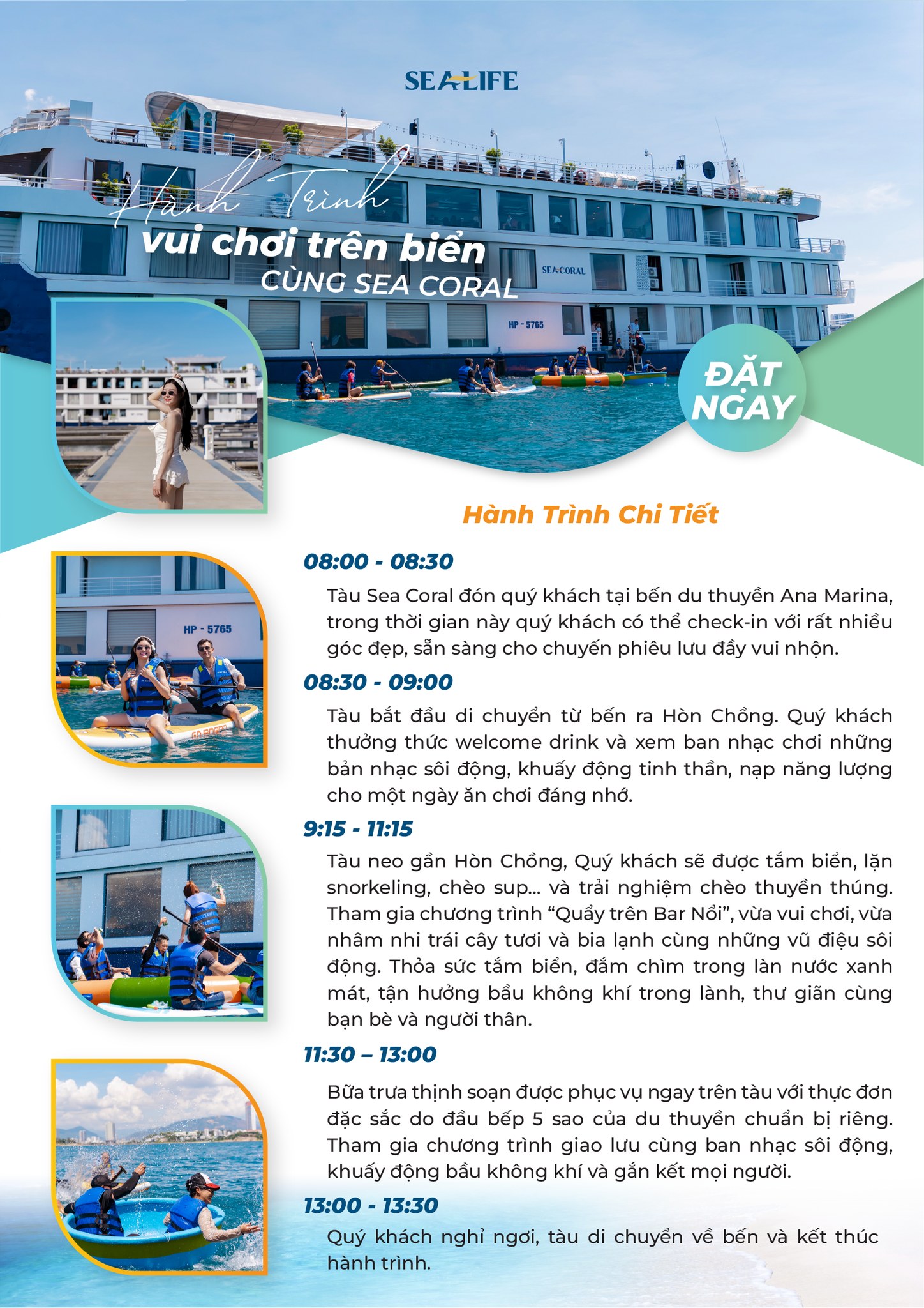 Hành trình đưa bạn du ngoạn trên vịnh Nha Trang xinh đẹp, thả hồn vào khung cảnh thiên nhiên hùng vĩ, thơ mộng. Tham gia các hoạt động vui chơi giải trí hấp và thưởng thức những món ăn ngon trên du thuyền Sea Coral.
